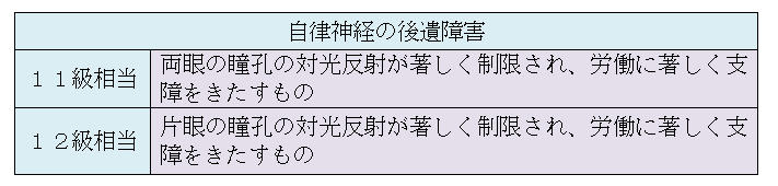 瞳孔の対光反射(たいこうはんしゃ)が著しく制限されており、労働に著しい支障をきたすような深刻なケースであれば、後遺障害の対象となります。片眼の場合は後遺障害等級12級に、両眼の場合は11級に該当する可能性があります。