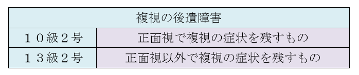 左右上下での複視は、軽度の頭痛や眼精疲労(がんせいひろう)の原因となりますが、正面視の複視ほどの大きな支障はありません。このような症状は、後遺障害等級13級2号の対象となります。