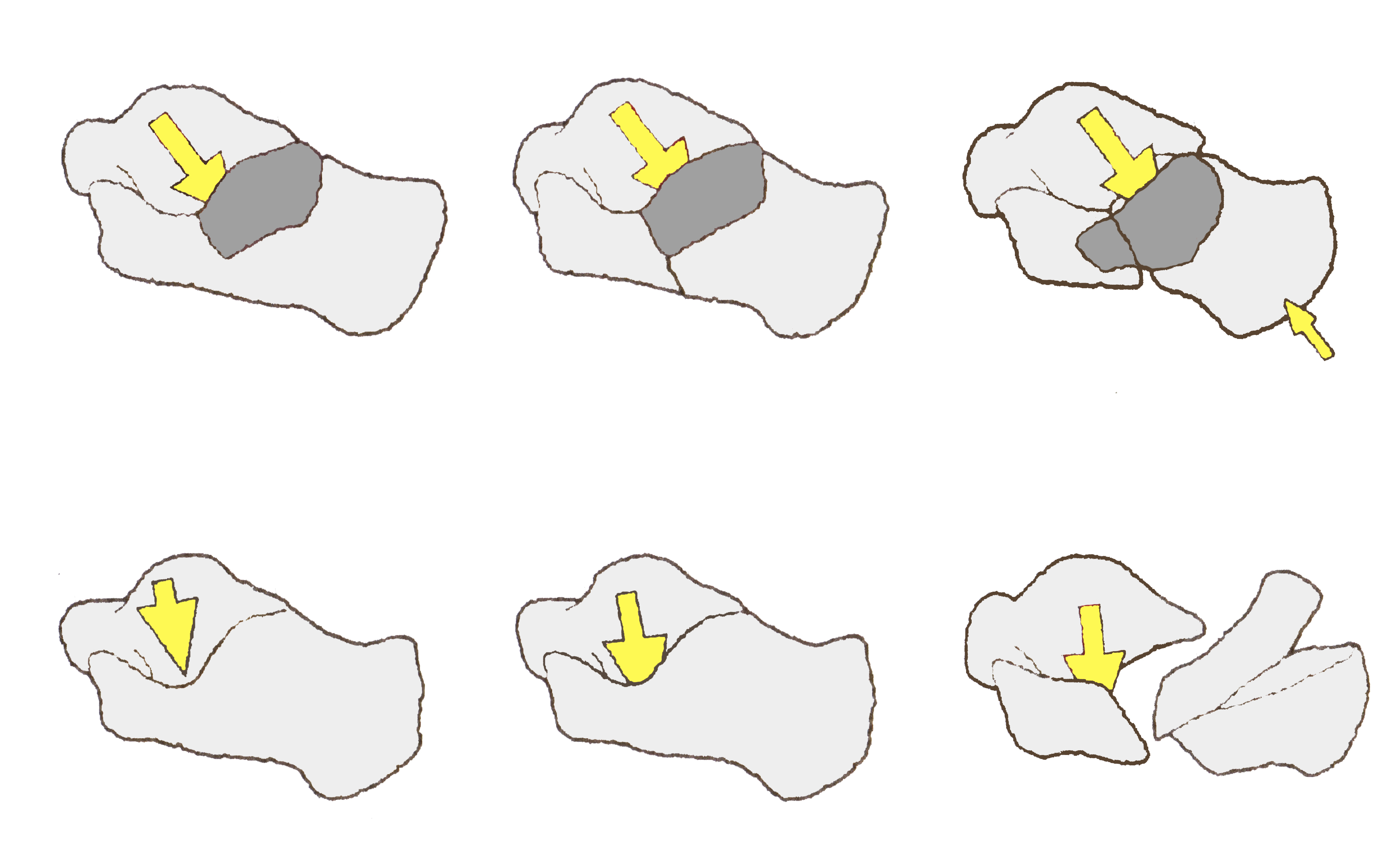 上のイラストを見てください。左のイラストが、「下方に向かって骨折するタイプ」です。右のイラストが、「後方へ向かって水平に骨折するタイプ」です。