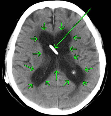 脳室が拡大することにより、周囲の脳は圧迫されます。このように急速に脳室が拡大した状態を、「急性水頭症」と呼びます。