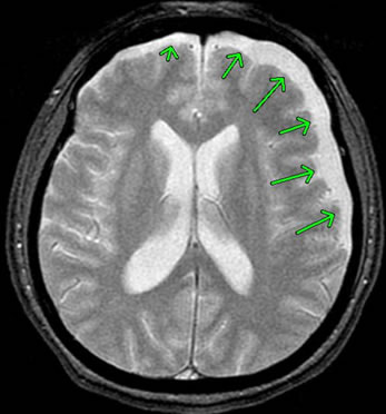 緑色の矢印の先に、急性硬膜下血腫を確認することができます。